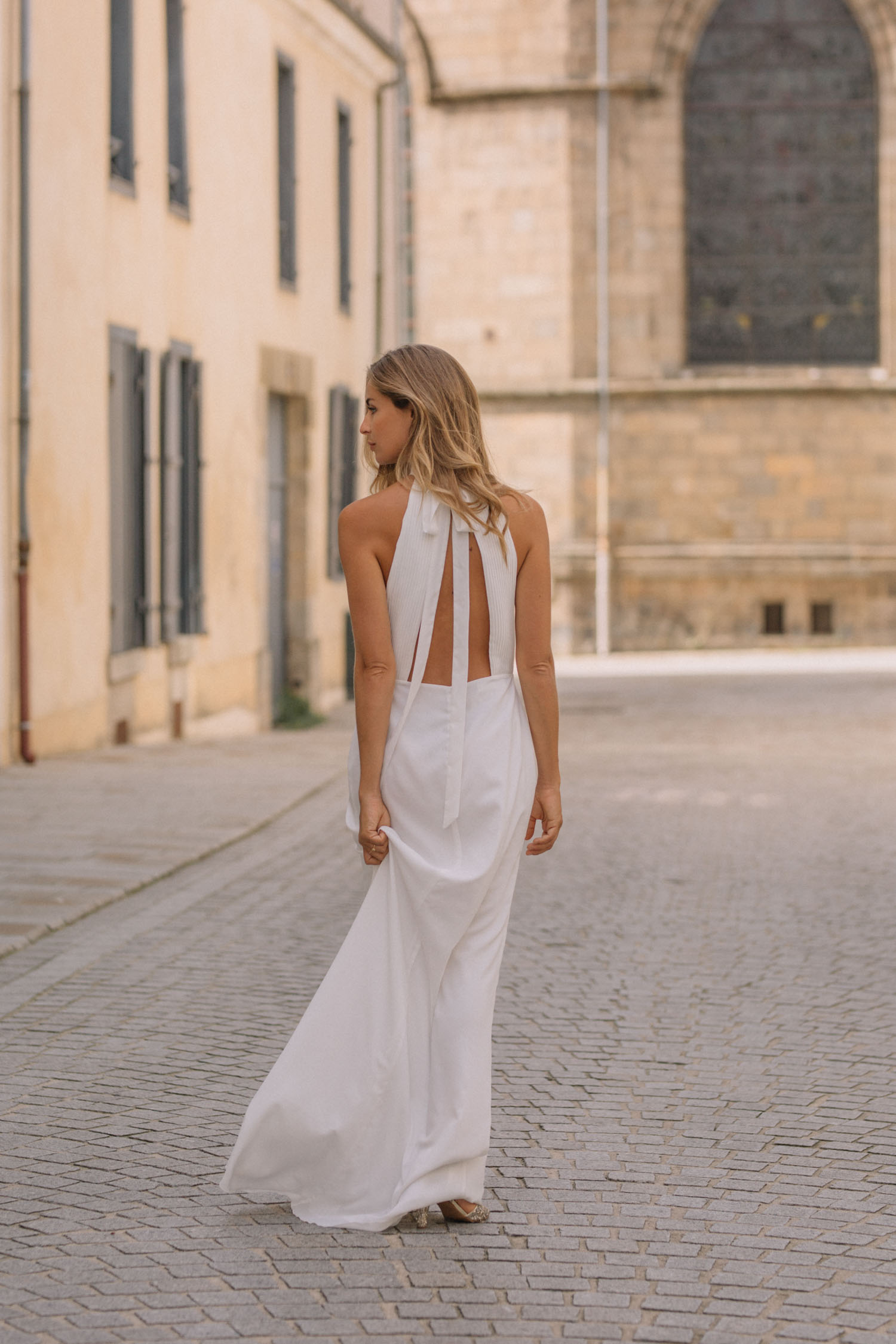 Les robes de mariée de Fabienne Alagama conjuguent l’intemporel et le glamour. Des lignes épurées, fluides et élégantes, avec des dos plongeants d’un grand raffinement. Des jeux de matières et de transparence. Un travail tout en délicatesse, avec de subtils détails. Son univers est poudré, lumineux, tout de froufrous et dentelles composé. Sa technique, instinctive et très couture.