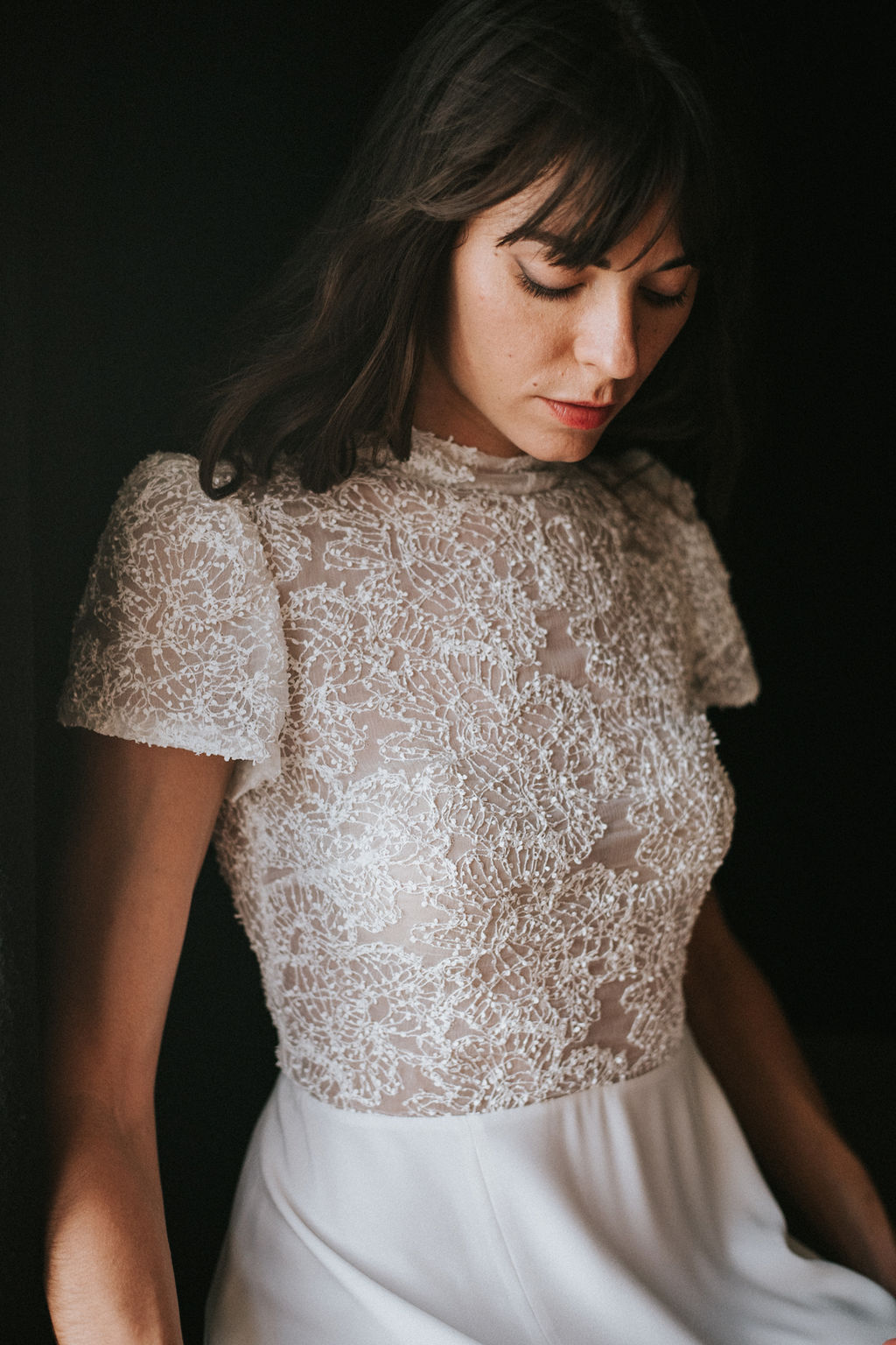 Elle sélectionne et recherche sans cesse de nouvelles matières : organza, plumetis, broderie, dentelles… qui l’inspirent pour dessiner ses nouvelles collections de robes de mariée.
